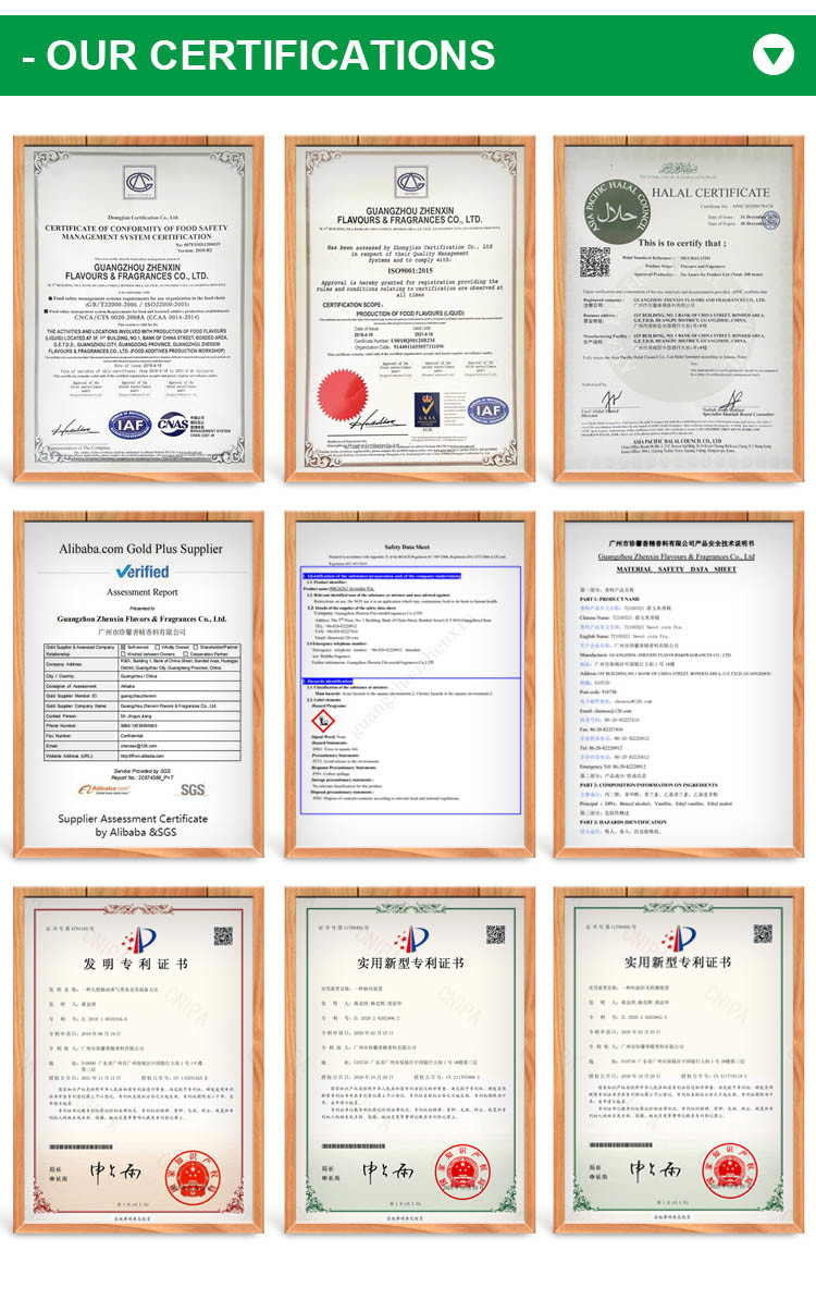 * हमारी कंपनी के उत्पादों की गुणवत्ता कंपनी की गुणवत्ता के अनुरूप हैशीर्ष 4 अंतरराष्ट्रीय स्वाद कंपनियां. हमारी कंपनी चीनी स्वाद कंपनियों के बीच बहुत प्रतिस्पर्धी है. सामान्य स्वाद और सुगंध के अलावा, हमारे नकली सुगंध प्रौद्योगिकी भी बहुत पुष्टि की है,और नकली सुगंधों की संख्या भी सबसे पूर्ण हैहमारे उत्पादों को 100 से अधिक देशों में बेचा गया है।